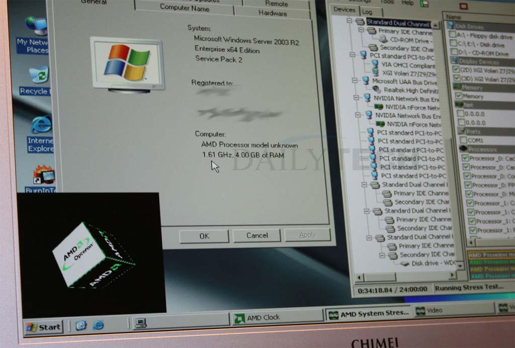 Au détour d’une allée, certains partenaires d’AMD présentaient une configuration animée par le Barcelona, le futur processeur d’AMD quatre coeurs pour professionnels, mais qui utilisera le socket AM2 quand même ainsi que la peu onéreuse DDR2. Par contre le processeur n’était cadencé qu’à 1.6 GHz, AMD rencontrant apparemment des problèmes pour obtenir des samples capables de fonctionner au delà de 2 GHz. Ces Barcelona restent néanmoins prévus pour le mois de juillet. Merci à VTR pour le relais.