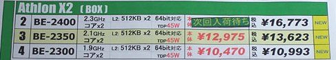 Aikiba PC Hotline nous rapporte que les Athlons X2 BE 2350 et 2300 commencent à faire leur apparition sur les étalages des vendeurs au Japon. Le X2 BE 2400 lui est annoncé sous peu comme en témoignent les affichages de prix des boutiques.