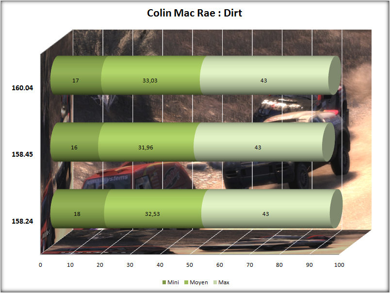 - Analyse : même conclusion que pour 3DMark 2006, les trois pilotes délivrent les mêmes performances, avec une moyenne identique aux erreurs de mesures près, et un framerate à la précision chirurgicale.