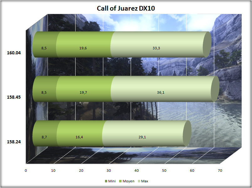- Analyse : sur ce benchmark, les pilotes officiels 158.24 marquent le pas par rapport aux versions bétas. Ces deux versions ayant été publiées plus tard, faut-il y voir là une optimisation de Nvidia sur ses pilotes d’essai? En moyenne les 158.24 sont plus lents de 3 images par secondes à peu près, ce qui représente 17%, mais ces chiffres n’ont que peu d’intérêt vu qu’à ce framerate, 16 ou 19 restent injouables ou incompatibles avec un confort de jeu. Les bétas eux se tiennent dans ce test.