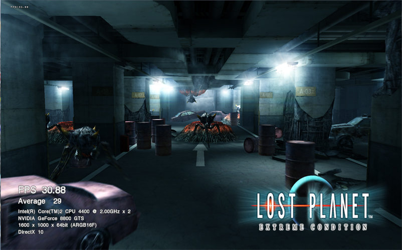 - Tiré d’un titre de Capcom développé sur XBox360, Lost Planet est un survival horror où les ennemis, les Akrid, sont une espèce d’insectes géants ayant un gros appétit d’humains. Il s’agit donc ici d’un portage de console vers PC qui n’amène rien de plus en terme graphique lors du passage sous DX10, tout comme Halo 2 sur PC. Pour l’instant c’est le marketting DX10 qui fait son job sur des titres n’étant pas DX10 nativement. Les options étaient réglées comme suit (cliquez sur le sminiatures pour agrandir).