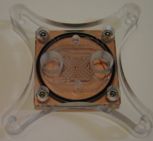 Intéressons-nous à présent plus en détail au waterblock à proprement parler. Le top en plexi laisse transparaitre le joint torique assurant l’étanchéité avec la base en cuivre. On distingue nettement le design en "X" des jets (principale nouveauté de cette version highflow) ainsi que les micro-canaux du maze.