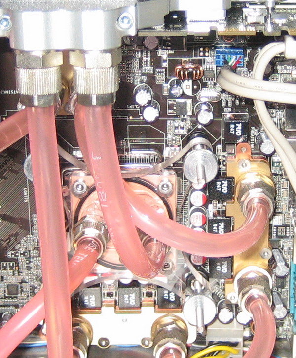 Passons au montage (très facile au demeurant) et au second inconvénient de la version Bold à savoir la necessité de démonter la carte mère pour installer les 4 vis de la fixation sochet 775. Des contre-écrous de l’autre coté des trous de fixation (derrière une entretoise en caoutchouc pour ne pas abimer le PCB) assurent le maintien tout en autorisant la souplesse nécessaire au passage du bloc au travers de ces 4 tiges filetées. Reste à installer les 4 ressorts et comprimer ces derniers à l’aide des gros écrous à main pour excercer une pression suffisante. Une fois les embouts et tuyaux en place on est prêt à attaquer les mesures.