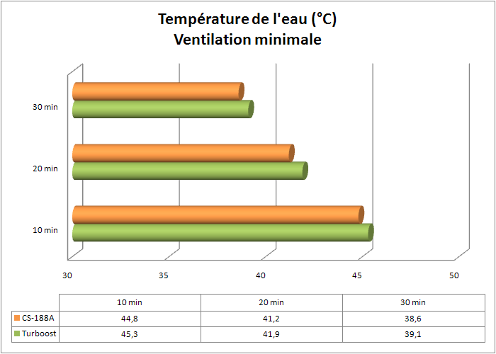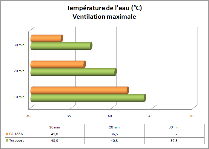 Avec les ventilateurs de 25cm à leur vitesse maximale, c’est le CS-188A qui prend une large avance sur le Turboost malgré son seul ventilateur, défiant tous les pronostics initiaux. Nous rappelons donc par contre que ces performances se font au détriment du confort auditif.