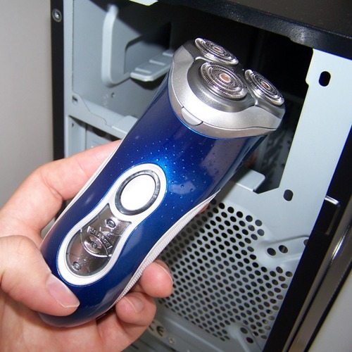 Le but de ce test est de mesurer les capacités insonorisantes de la structure même des boîtiers. Ventilateurs éteints, un rasoir électrique est introduit à l’intérieur du boîtier (source de bruit constante et fixe), et des relevés sonores sont réalisés dans différentes directions de propagation du bruit, permettant ainsi que déterminer si un boîtier emprisonne bien le bruit vers l’avant ou les côtés.
