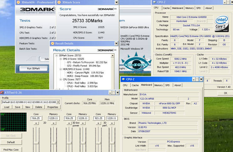 Nos confrères de VR-Zone nous rapportent que le célèbre overclockeur Shamino a battu le record sous 3DMark 2006. Evidemment pour battre ce record, un Sempron s754 a été overclocké à 1.8 GHz, et le GeForce 2 Pro 32 Mo a lui aussi été overclocké. Plus sérieusement, il faut un processeur de brute vu que la note CPU compte dans le score final, aussi il a utilisé le dernier né des usines Intel introduit il y a deux jours, le QX6850 qu’il a pris soin d’overclocker à plus de 5GHz grâce à son souffle de l’azote liquide. Les deux cartes graphiques sont les plus rapides du marché, deux 8800Ultra overclockées à 916/1228 MHz, le tout sur carte mère eVGA Nvidia 680i. Ah oui j’oubliais le score : 25 733 avec des scores GPU à + 10 000!!!