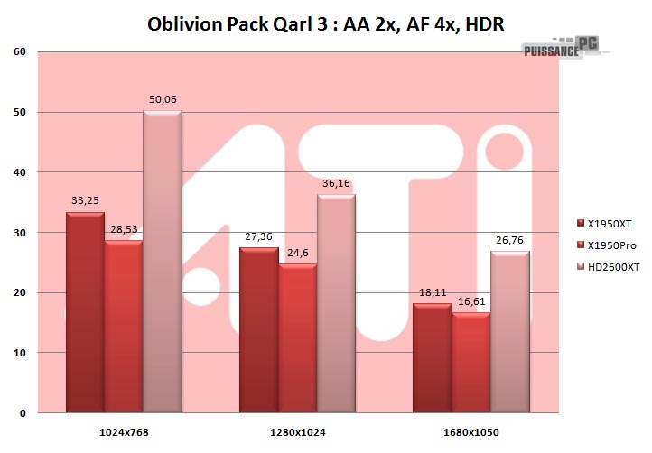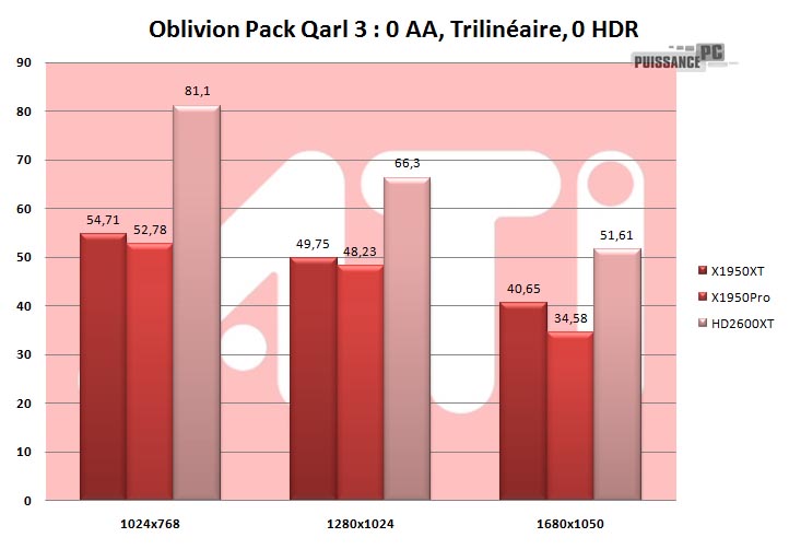 - La grande surprise qui n’en est pas vraiment une : le HD2600XT caracole en tête sur ce test, la raison est clairement les 512 Mo de GDDR3. En effet sans pack la carte suit de peu les X1950, et avec pack, la perte est minime, comme si la carte ne décelait aucun pack. La preuve que les 512 Mo ont encaissé le surplus de texture. Déja performante sans pack , le HD2600XT 512 Mo confirme sous ce test. Les X1950 ne peuvent compenser le manque le manque de ram par une puissance générale meilleure. HD2600XT OK