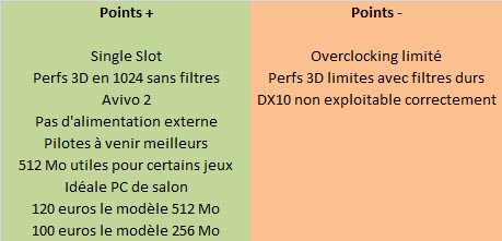 - Après tous ces tests je dois dire que je suis surpris par la carte. En fait je ne pensais pas qu’elle en serait là vu les quolibets dont elle a fait l’objet sur la toile. Certes ce n’est pas la carte ultime, mais par rapport au 8600GTS j’en garde un avis de quasi égalité.