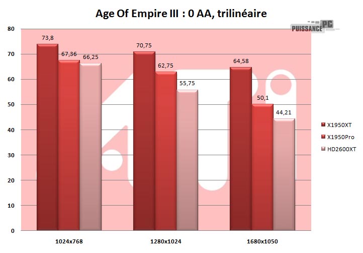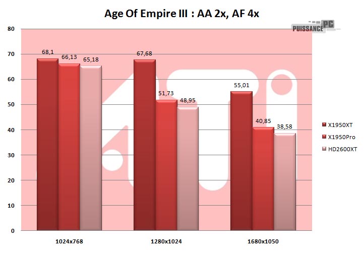 - Sans filtres et avec filtres, en 1024, les 3 cartes se tiennent vraiment dans un mouchoir de poche, offrant une expérience de jeu tout à fait satisfaisante……sauf pour un écran LCD qui doit interpoler et cela déteriore grandement la qualité de l’image, même celle avec filtres. Globalement le HD2600XT est ici un peu derrière le X1950Pro, et l’écart entre les deux se réduit dès que l’on monte en résolution et que l’on applique les filtres. Le X1950XT ici est au dessus du lot dans tous les cas de figure. HD2600XT KO