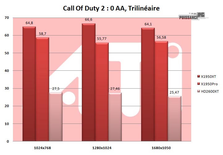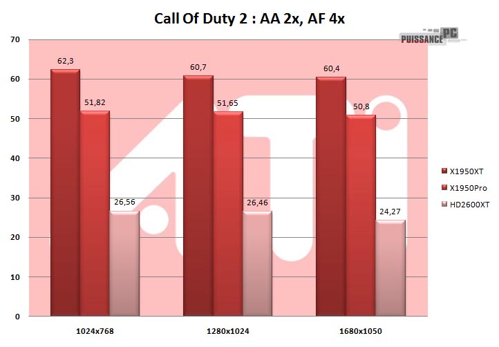 - Quelle que soit l’application, le jeu est une plaie pour notre HD2600XT, qui vraiment se retrouve largué et pas qu’un peu. Autre curiosité, les moyennes sont sensiblement les mêmes quelles que soient les résolutions, avec ou sans filtres, et ce pour toutes les cartes. Pour autant le synchronisation verticale était désactivée, et hormis le HD2600XT qui manque de peps dans ses résultats, les moyennes semblent bloquées autour de 60 images par secondes sur X1950. HD2600XT KO.