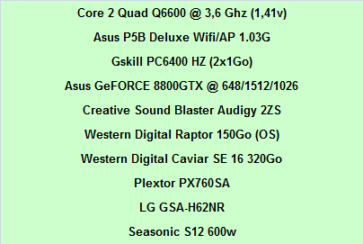 Pas moins de 6 waterblocks sont employés concernant la plupart des éléments "chauffants", dont le CPU et le GPU pour les principaux. Pour le reste, on note une pompe Laing DDC1+ adaptée aux pertes de charge élevées d’un tel circuit. Pour finir sur le matériel, les ventilateurs coiffant le radiateur sont des Papst 4412F/2.