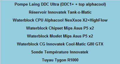 Un Quad Core ainsi qu’une 8800GTX overclockés, voici qui dégage des calories. Pour les transmettre à notre radiateur, voyons à présent le circuit de watercooling retenu :