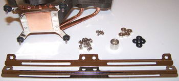 Voici donc tout d’abord les pièces nécessaires à l’installation du GeminII sur une plateforme S775. On remarque un nombre assez conséquent de vis, d’autant qu’il faut ajouter à celles sur la table les 4 du module de rétention du GeminII.