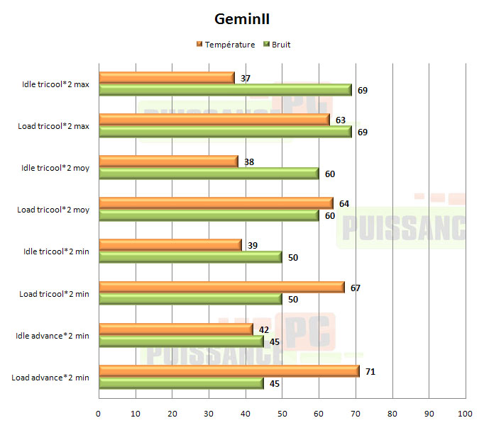 Le GeminII parvient donc à s’imposer parmi les meilleurs modèles de notre comparatif. Pas spécialement par ses performances « processeur », qui ne sont pas les toutes meilleures, mais par ses prestations globales de refroidissement de tout le haut de la carte mère, ainsi que par son prix raisonnable même s’il faut lui ajouter 2 ventilateurs. Les Advance VA-120 que nous avons utilisés lors de ce comparatif sont d’ailleurs la preuve que l’on peut trouver de bons petits ventilateurs pour pas cher: ils nous ont coûté moins de 4€ pièce et offrent des prestations en souffle et niveau sonore appréciables, et tout à fait adaptées au GeminII.