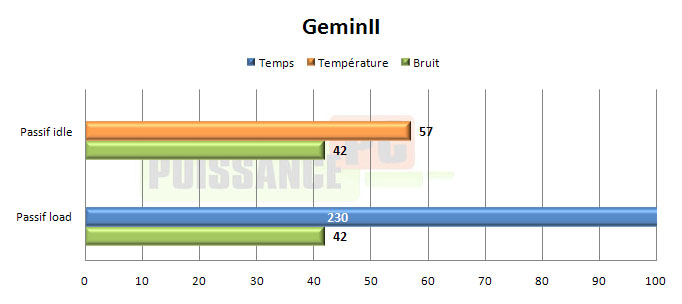 Le GeminII n’est visiblement pas taillé pour le passif, malgré le fait qu’il soit vendu sans ventilateur. Déjà à 57° en idle, son temps de seulement 230s en moyenne avant que le processeur se mette en protection est un des plus mauvais de nos modèles testés en passif.