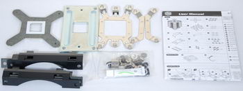 Voici les pièces nécessaires à l’installation sur socket 775. Une remarque tout d’abord: il est possible au choix d’installer le radiateur avec ou sans plaque arrière. Les deux montages nécessitant de toute manière l’accès au dos de la carte mère, nous avons opté pour le montage avec plaque, en toute logique dirons-nous vu le poids du Z600.