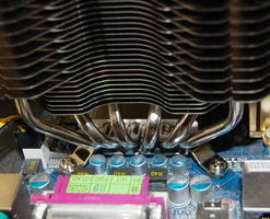 6 grands caloducs, des ailettes interminables et plutôt bien espacées pour envisager du fanless, une finition tout à fait correcte, l’impression visuelle est plutôt bonne surtout quand on la compare à celle du GeminII, le précédent monstre de Cooler Master, à la finition bien moins encourageante. Le design du Z600 inspire lui confiance.