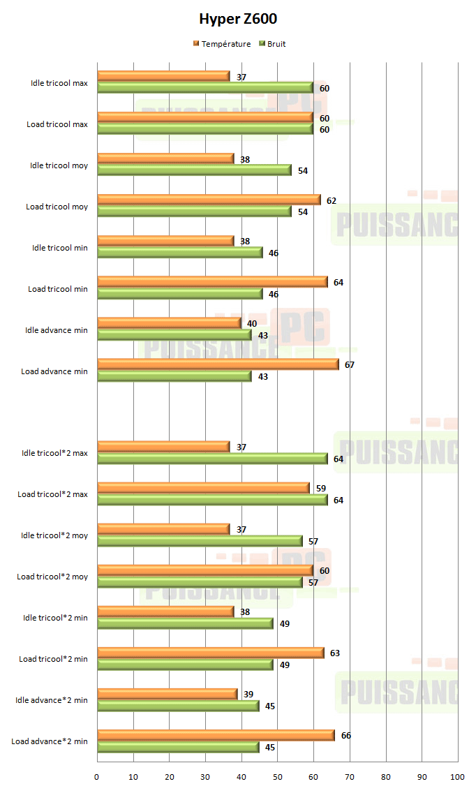 Les performances du Z600 sont bonnes avec ventilation, mais ne lui permettent pas de jouer dans la cours des plus grands, comme l’IFX-14 de Thermalright ou l’Orochi de Scythe. Alors qu’il est dans le top 3 des modèles les plus lourds de notre comparatif, ses performances avec ventilation le placent plutôt au niveau des Ultra 120 Extreme ou Noctua NH-U12P par exemple. Cela reste bien évidemment excellent, nous parlons là de ventirads qui sont tous dans le « Top 10 » de notre grand comparatif.