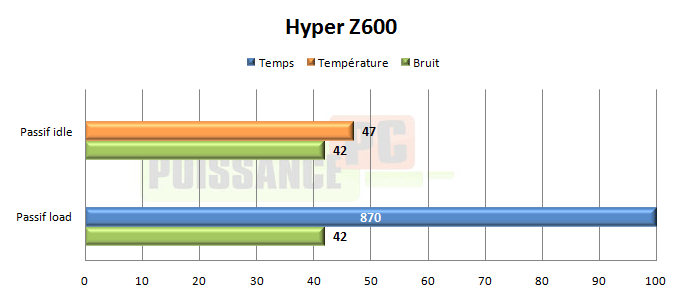 En passif le Z600 montre tout son potentiel. Conçu à la base principalement pour ce mode de fonctionnement, il reprend la caractéristique qui a fait le succès du Ninja de Scythe en passif: des ailettes fortement espacées permettant à l’air chaud de mieux s’extraire de la zone du radiateur. Le résultat est vraiment excellent avec 47° en idle, pour un temps avant la mise en sécurité du processeur de près de 15 minutes ! Seul l’Orochi est parvenu à faire mieux, mais en étant plus cher…