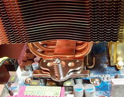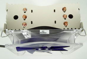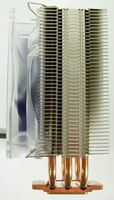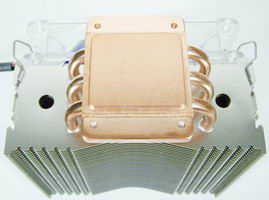 Une fois le regard détourné du ventilateur, une autre constatation saute aux yeux: l’air de famille du radiateur avec Noctua, et plus précisément la première version du NH-U12, celui qui est partie intégrante du NH-U12F. Les ailettes ont juste pas tout à fait la même forme et moins profondes, et surtout le Silentator n’a que 3 caloducs là où le NH-U12F en a 4, mais les différences s’arrêtent là.