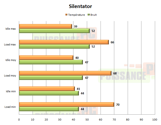 A pleine vitesse le Silentator est légèrement audible mais rien de très dérangeant, et offre un 66° très correct, une configuration classique pas particulièrement silencieuse se satisfera tout à fait d’un tel ventirad. Pour les adeptes du silence le potentiomètre permet de choisir à sa guise son niveau sonore jusqu’à du très silencieux, avec des performances qui restent correct puisque nous n’avons pas dépassé les 70°.