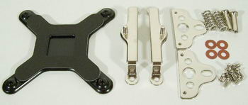 Voici les pièces nécessaires à l’installation sur LGA775. On notera la présence des nouvelles barres de maintien mises au point par Noctua suite aux remarques des utilisateurs, avec des petites tiges qui permettent de mieux placer les ressorts.