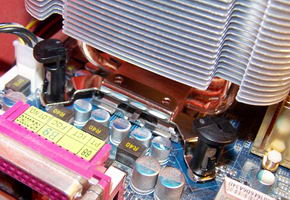 Comme nous l’indiquions dans la présentation du bundle, le kit de fixation pour le socket S775 est d’origine vissé au ventirad. Il s’agit comme souvent pour les ventirads légers d’un système de fixation « radbox » avec les 4 clips en plastique.