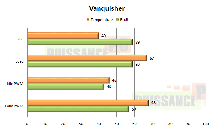 Le PWM est également particulièrement bien adapté au ventilateur du Vanquisher qui en idle fait tomber le niveau sonore à 43dBA, quasiment au niveau du fanless donc. Il faut quasiment coller l’oreille au ventilateur pour l’entendre légèrement vrombir.