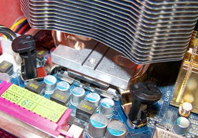 L’installation se fait ensuite comme avec tous les ventirads avec fixations type radbox, si ce n’est qu’ici les 2 clips situés sous le ventilateur sont particulièrement difficiles d’accès. Vous pourrez donc soit installer le radiateur avant de mettre le ventilateur pour vous simplifier la tache, soit forcer un peu sous le ventilateur pour tout de même attraper les clips (gros doigts interdits).
