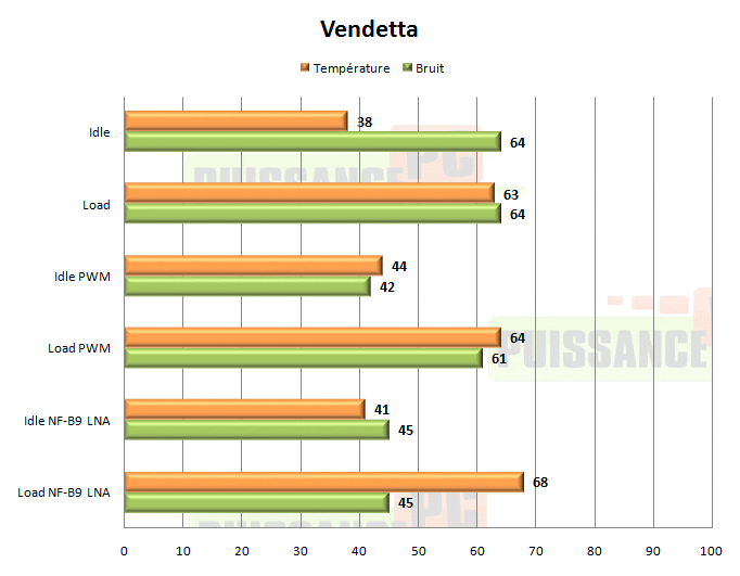 Nous avons testé avec un ventilateur 92mm non PWM pour fixer un niveau sonore que nous souhaitions. Nous avons pour cela utilisé un Noctua NF-B9, en le sous-voltant à l’aide d’un module LNA pour qu’il tourne à environ 1300tpm pour 45dBA soit un niveau sonore très silencieux même en pleine charge donc. Nous avons alors obtenu un excellent 68° en charge, preuve que le Vendetta n’a vraiment pas besoin d’un ventilateur aussi puissant que celui d’origine, qui au contraire nuit plus qu’autre chose à son potentiel performances/bruit.