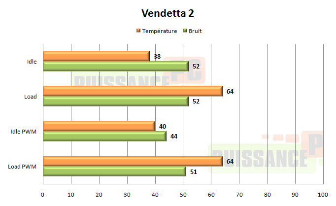 La prestation réalisée par le Vendetta 2 est donc en réalité bien meilleure que celle réalisée par son aîné de taille réduite, tandis que le PWM marche toujours à merveille, donnant un ventirad légèrement audible en charge, et très silencieux au repos, un bonheur pour les oreilles.