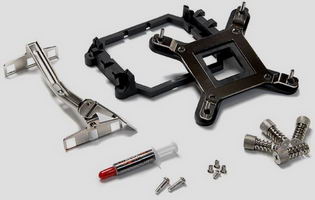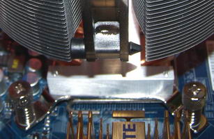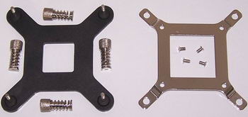 L’installation sur une carte mère LGA775 se fait grâce à une plaque arrière et un module de rétention que l’on visse sur la base du radiateur. Pour finir de solidariser le tout des écrous à ressorts sont fournis.