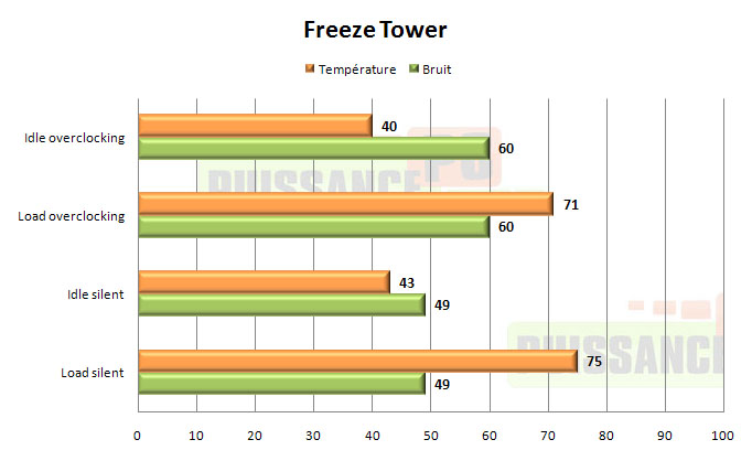 Le Freeze Tower paie le prix de sa conception « légère ». Deux caloducs et un ventilateur 80mm ne peuvent aboutir à un ventirad à la fois silencieux et performant. Silencieux, le Freeze Tower parvient à l’être grâce à son mode « Silent », mais en aucun cas il n’est réellement performant, même avec son mode « Overclock » qui emballe le ventilateur 80mm à plus de 3000tpm et est très désagréable à l’oreille, sans parvenir pour autant à apporter un réel gain en températures.