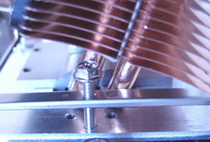 Il reste alors à placer le ventirad, puis à glisser les petites pattes de fixations dans les encoches du support posé sur la carte mère, puis à visser en leur milieu des vis longues afin de faire en sorte que les pattes de fixation viennent forcer dans les encoches du support, maintenant ainsi le Katana Cu en place.