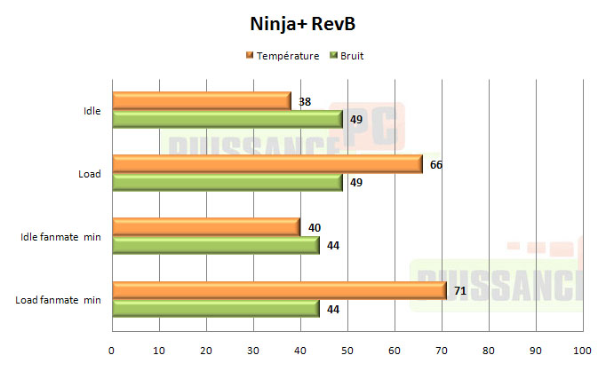 Les mesures avec ventilateurs sont pour le moins surprenantes. En effet alors que l’Infinity était censé être le meilleur modèle de la gamme Scythe, le Ninja+ RevB obtient exactement les mêmes performances, et les mêmes niveaux sonores tant en 12V qu’une fois sous-volté avec un fanmate 2 de Zalman.