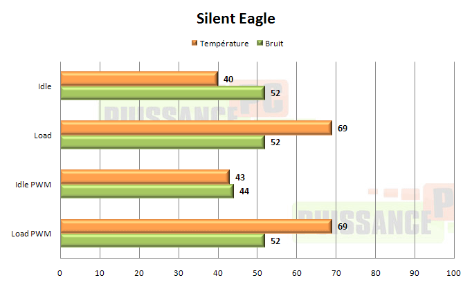 Le ventirad de Sharkoon est de plus très silencieux en idle avec le PWM activé, 44dBA c’est inaudible à plus de 20 ou 30cm du ventilateur, et le Silent Eagle CPU Cooler se permet pourtant dans ces conditions minimales de souffle de maintenir le processeur à 43° seulement.
