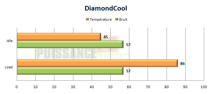 C’est sans surprise, vu les problèmes de montage rencontrés, que le DiamondCool affiche des performances atroces. Les températures obtenues sont supérieures à celles du radbox Intel, et le ventirad de Spire est également plus bruyant.