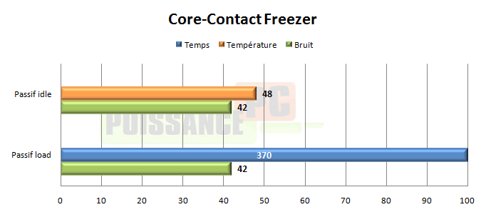 Les performances du Core-Contact Freezer sont vraiment excellentes, et si l’on pouvait craindre qu’elles ne chutent avec une baisse importante du flux d’air comme chez certains radiateurs dont les ailettes ne sont pas très espacées, il n’en est finalement rien et même en vitesse minimale les performances sont de tout premier ordre. Il faudra d’ailleurs privilégier un plage de fonctionnement variant entre le minimum et la mi-course du variateur car quand on approche de la pleine vitesse les 60dBA et plus du ventirad sont vraiment désagréables.