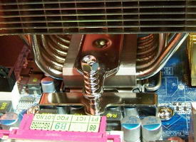 Il reste ensuite à visser les 2 pattes de maintien S775 sur la surface de la carte mère, puis à monter le HR-01 Plus en vissant la tige de fixation à ses 2 extrémités sur les pattes de maintien. La tige possède un détrompeur afin de bien se positionner sur le radiateur.