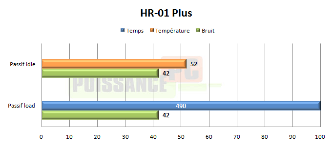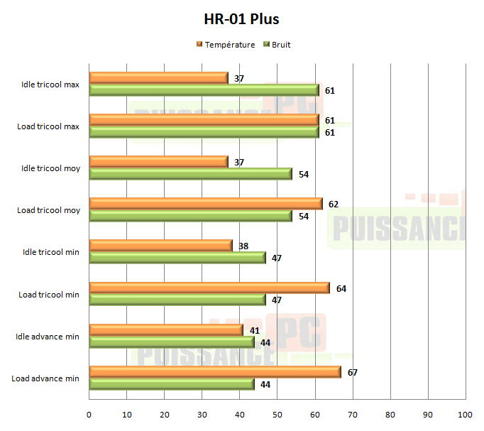 Le HR-01 Plus est un très bon performeur, cela ne fait aucun doute, mais qui reste globalement derrière son confrère l’Ultra 120 eXtreme, mais de peu. Une exception tout de même: avec l’Advance VA-120 sous-volté au maximum, c’est à dire une très faible vitesse de rotation de l’ordre de 600tpm, le HR-01 Plus prend la tête et ce de manière sensible: 2° de mieux. Sa vocation pour les faibles flux d’air est donc bien avérée, il nous reste à voir si le passif sera également un de ses points forts.