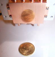 La base du V1 ressemble en fait beaucoup à celles des BigTyp 120 et MiniTyp 90, avec des stries assez marquées, mais avec juste en plus un effet miroir qui commence à réfléchir un peu notre pièce de monnaie, mais certainement pas un miroir parfait comme l’image de la fiche officielle du V1 chez Thermaltake.