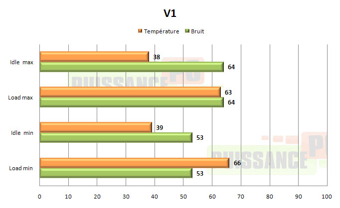 Une fois le V1 en vitesse minimale grâce à son variateur, le niveau sonore devient acceptable, mais le ventilateur reste audible ce qui est très décevant car cela signifie qu’il est impossible d’avoir réellement du silence avec ce ventirad. C’est d’autant plus navrant que les performances du V1 restent excellentes au minimum, la possibilité de descendre encore de quelques centaines de tours par minutes la vitesse du ventilateur aurait été vraiment appréciable, pour ne pas dire indispensable, et n’aurait certainement pas beaucoup impacté les bonnes performances du V1.