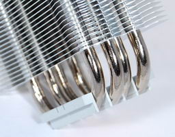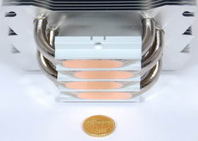 Mais les différences ne s’arrêtent pas là et un 4è caloduc a fait son apparition également. Contrairement à Sunbeam avec son Core-Contact Freezer, Xigmatek a décidé de ne plus les aligner par contre, et les caloducs sont ainsi décalés deux-à-deux.