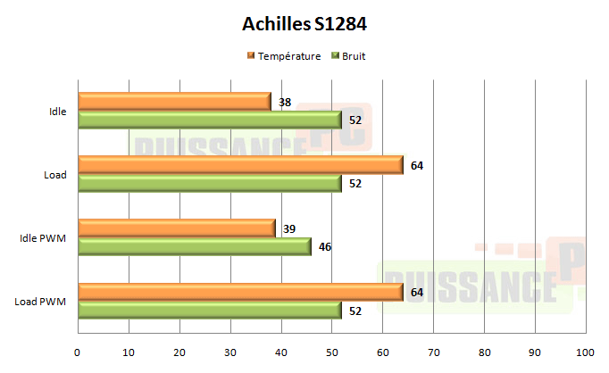 Compatible tous sockets, le Achilles S1284 est particulièrement haut, quasiment 16cm, donc attention à la compatibilité avec votre boîtier. Le ventilateur PWM est donné pour une vitesse oscillant entre 800 et 1500tpm et devrait donc offrir un silence de fonctionnement appréciable.