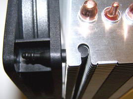 Un autre très bon point pour Xigmatek: le système de fixation du ventilateur. Ce sont des pions en caoutchouc en effet qui tiennent le ventilateur, limitant ainsi les vibrations. Ces pions sont très bien conçus puisqu’ils viennent se fixer aux bords des ailettes de manière sûre d’un côté, et de l’autre il suffit de tirer un peu sur le pion pour le fixer aux trous du ventilateur, et celui ci se retrouve sans aucun contact réel avec le radiateur, si ce n’est donc par l’intermédiaire du caoutchouc. Très efficace et bien mis en oeuvre: bravo.
