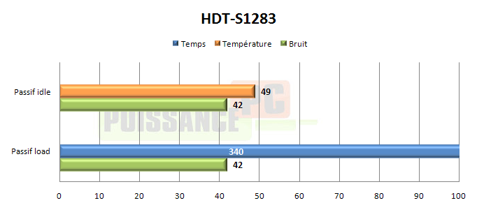 En passif le radiateur de Xigmatek affiche une température impressionnante en idle. Il s’effondre malheureusement en charge pour ne tenir en moyenne que 340s avant que la sécurité thermique du processeur ne se déclenche. La technologie Direct Touch semble montrer ses limites: elle permet d’améliorer l’échange avec les ailettes du radiateur, mais lorsque celles-ci satures le Direct Touch n’est plus d’aucun secours et les performances s’effondrent.