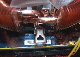 Autre détail qui peut avoir son importance: la patte de fixation, une fois montée venait sur notre Gigabyte 965P-DS3 effleure le premier slot mémoire. Y placer une barrette entraîne un contact qui n’est pas souhaitable.