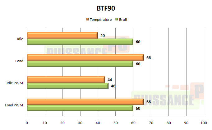 Les performances du BTF90 sont plutôt bonnes pour un ventirad avec ventilateur de 92mm. Avec 66° en pleine charge notre processeur n’est pas près d’avoir chaud. Par contre ce sont nos oreilles qui chauffent un petit peu, car même si le BTF90 n’est pas tout à fait dans le groupe des ventirads les plus bruyants de notre comparatif, il est tout de même à 60dBA à 5cm ce qui est désagréable.