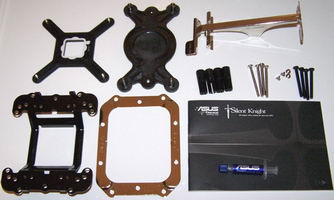 Le bundle du Silent Knight est un peu plus imposant que ceux des autres modèles haut de gamme Asus de notre comparatif, avec la présence d’une seconde plaque arrière et d’un cadre métallique pour permettre des montages sur plateforme AMD avec ou sans conservation du socle d’origine autour du socket.