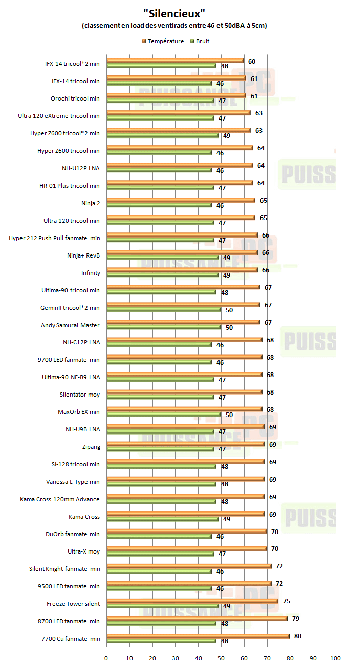 Une nouvelle fois les Thermalright IFX-14 et Scythe Orochi dominent ce classement, cette fois-ci avec des Antec Tricool au minimum. L’IFX-14 a toujours une courte avance, mais d’un rien, l’Orochi semblant moins perdre en efficacité lorsque le flux d’air diminue. L’Ultra 120 eXtreme derrière les 2 monstres est lui cette fois talonné par les Noctua NH-U12P, HR-01 Plus ou encore Scythe Ninja 2, qui d’ailleurs fait directement son apparition dans ce classement puisque c’est en vitesse maximale qu’il est à 46dBA. Un choix que les amateurs de silence apprécieront.